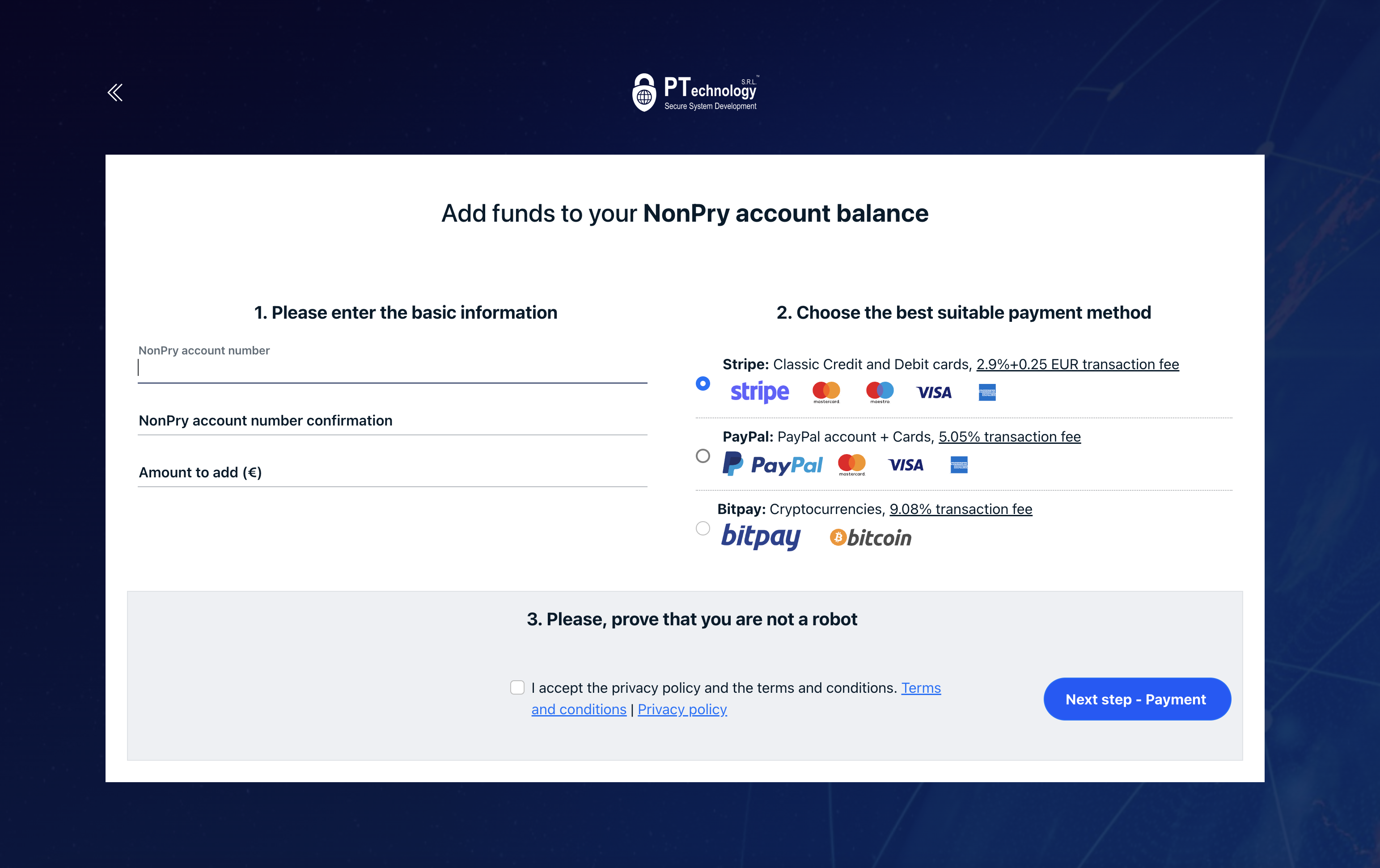 Scroll down, and click the "PPcrypt/NonPry balance topping up" button, depending on what type of account you want to top up.